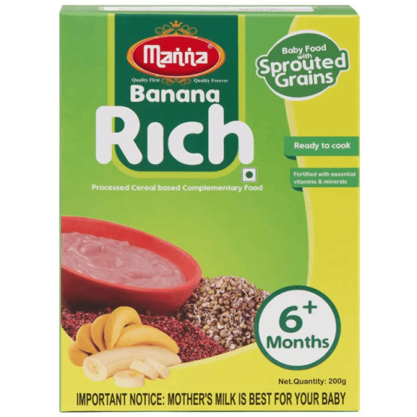 • Manna Rich Baby Cereal is nutritious mix of sprouted ragi, green gram and bengal gram. It is a complementary food for babies from the age of 6 months and above
