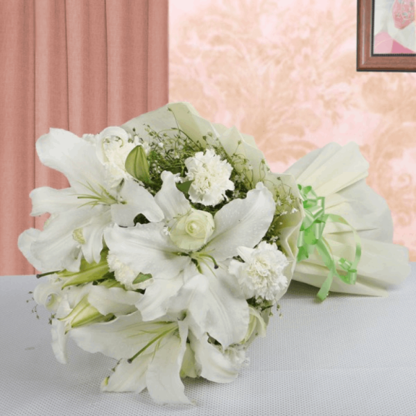Lilies are the fourth most popular flower in the world ranking following their beauty. They are the favourite of the Greeks as they believe that it is a Holy flower. Gift someone this bunch of 4 White Asiatic Lilies & 10 Pink Roses in Premium MFT Golden Vase and let them know how special they are.