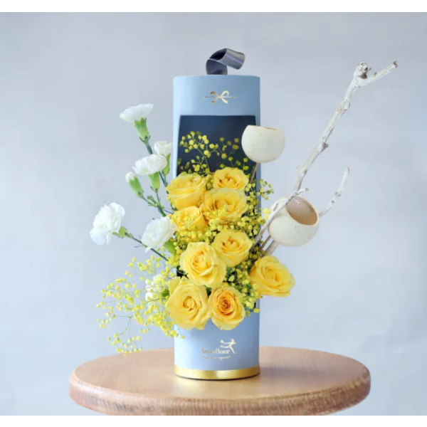 A precious disposition to infuse your loved one's day with cheer. This floral arrangement includes a blue cut-out box with bright and vivid yellow roses, yellow gypso, white carnations, dried bell cups and a white dried branch. A testament to the love you share.